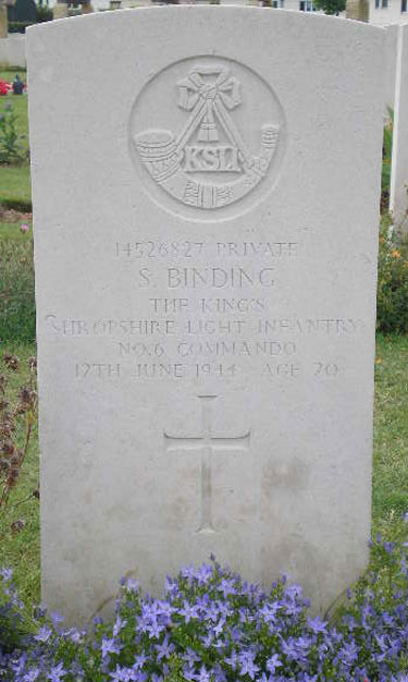 Prt. Sydney Binding, formerly of the King's Shropshire Light Infantry, served with No.6 Commando from, at least, 5th June 1944. Prt. Sydney Binding was reported as Killed In Action (KIA) on 12th June 1944, aged 20 years, when he stood on a landmine whilst out on patrol. He was the son of Mrs. M. E. Binding, of |