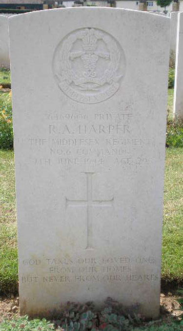 Prt. Robert Arthur Harper, formerly of the Middlesex Regiment, served in No.6 Commando. Prt. Robert Harper was reported as being Killed In Action (KIA) on 7th June 1944, aged 29 years, whilst engaged in the action of attacking a German field gun position in Breville Wood. He was the son of William and Emma Annie Harper, of Surbiton, Robert was laid to rest in Ranville War Cemetry ( The inscription on his headstone reads: ‘God takes our loved ones from our homes, but never from our hearts.’ |